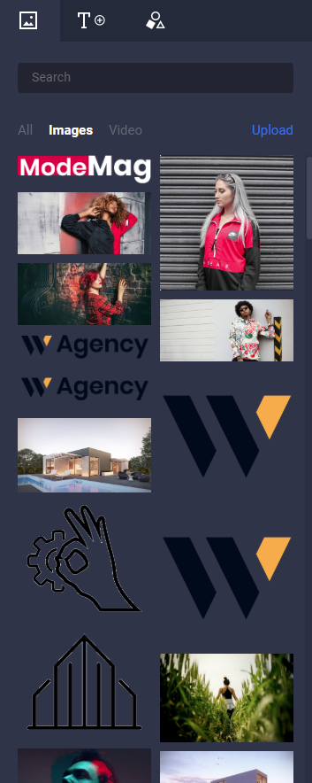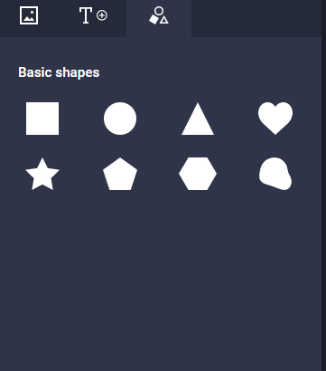 Lets go through the different options you have. We will start with the Element side bar shown below. Under the images/videos option you will be shown all the media currently upload to your library. Clicking on the text option will provide you with 3 options to choose from. You are also able to add in basic shapes as shown below. To add any of these elements click, drop and drop them into your art-board / web story page.