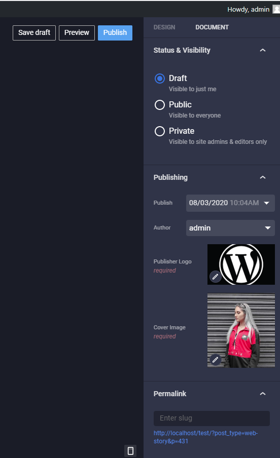 Leave the document link blank, as once you click publish this will be auto filled with the link of the story itself, you will also be given the option once you click on publish to add your story to a new post on your website or view your story.