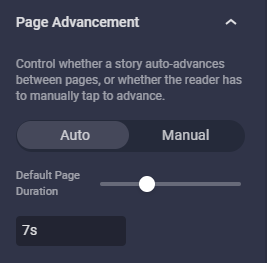 Once you have created all the pages/screens for your story you can click on the document panel, here you can preview, save draft or publish your story, you are also able to do this on the main screen of your story as shown below. The logo and the cover image are required and will show up as a preview before someone clicks through your story. Under the advanced tab you are able to set the duration of each page/screen in your story and also set whether you want your story to scroll automatically or manual having the user click the next and previous arrows on your story to view the other pages/screens.